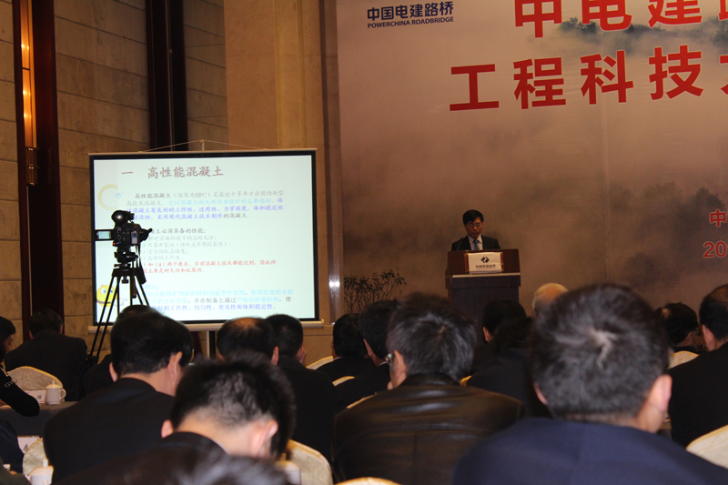四川特科新型建材有限公司董事长苏笮斌在中电建路桥集团科技大会上发表题目为高性能耐久性混凝土的主旨演讲。
